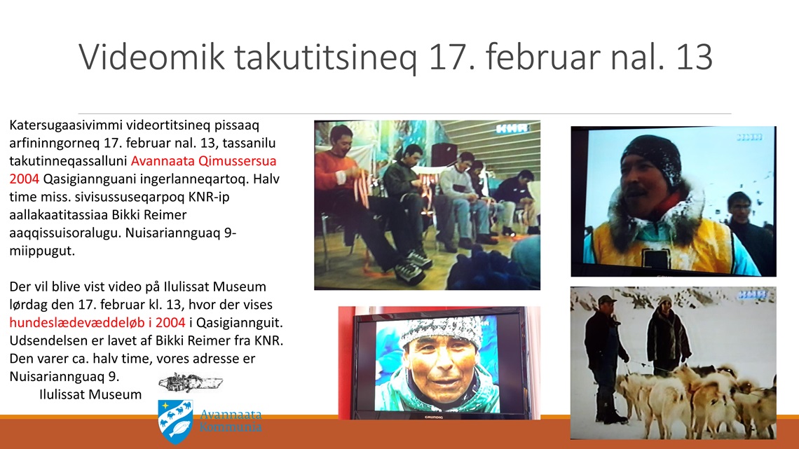 Der vil blive vist video på Ilulissat Museum lørdag den 17. februar kl. 13, hvor der vises hundeslædevæddeløb i 2004 i Qasigiannguit. Udsendelsen er lavet af Bikki Reimer fra KNR. Den varer ca. halv time, vores adresse er Nuisariannguaq 9.