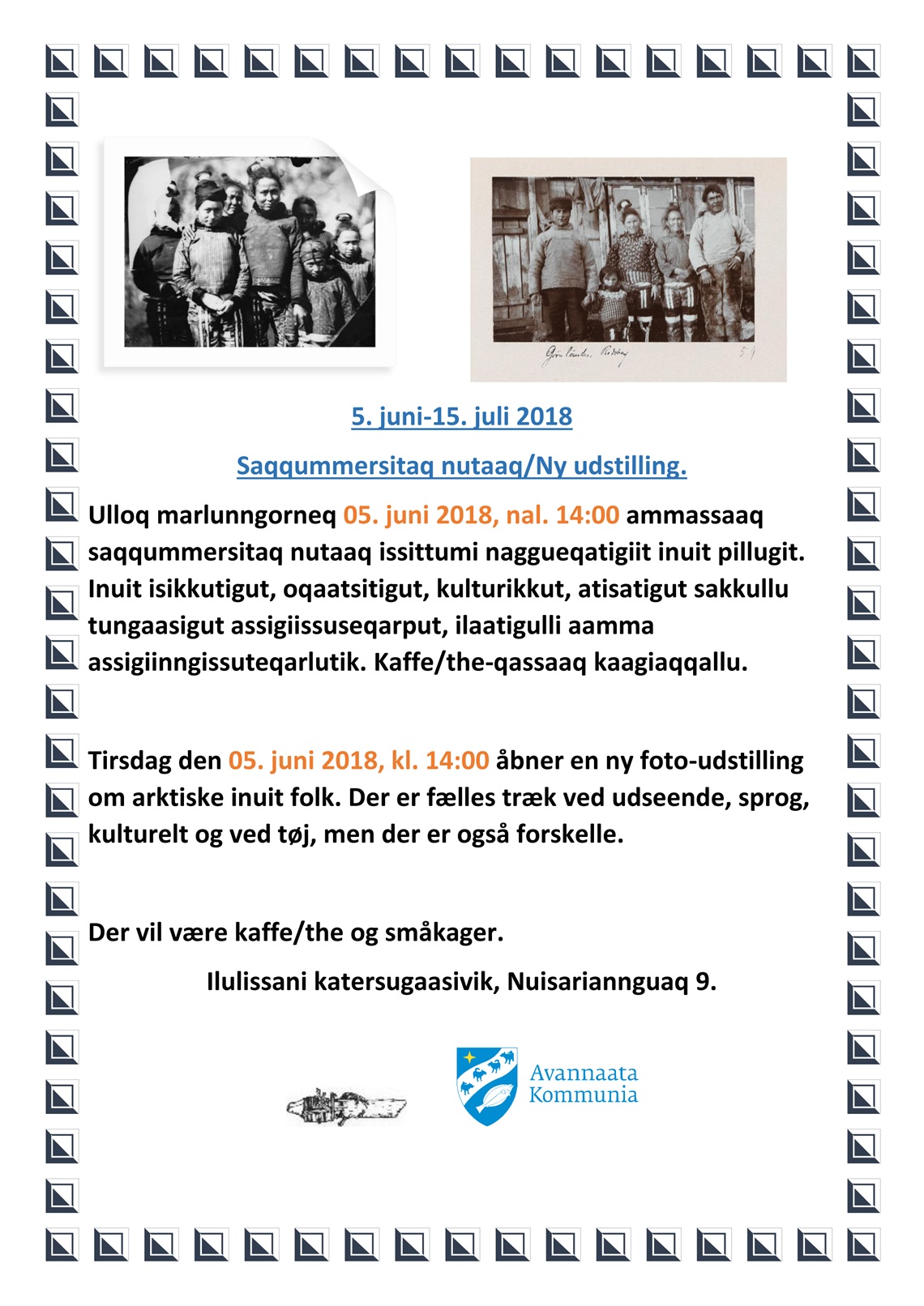 Tirsdag den 05. juni 2018, kl. 14:00 åbner en ny foto-udstilling om arktiske inuit folk. Der er fælles træk ved udseende, sprog, kulturelt og ved tøj, men der er også forskelle.