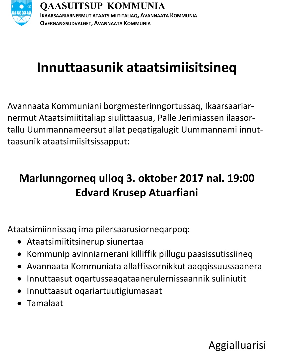 Kommende borgmester for Avannaata Kommunia, formanden for Overgangsudvalget, Palle Jerimiassen, afholder sammen med andre medlemmer fra Uummannaq borgermøde i Uummannaq: