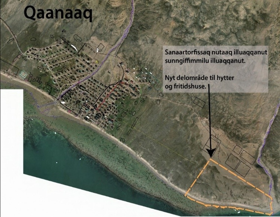 Kommunip pilersaarutaanut tapiliussaq suliarineqarpoq qinnuteqaatit kissaatillu aallaavigalugit, sumiiffik K illuaqqanut aasarsiortarfinnullu Qaanaamiittoq atugassiaralugu sumiiffik illoqarfimmut qanittuussammat kuuk angunagu inissinneqassaaq illoqarfiup kangiani sissamut qanittumut.