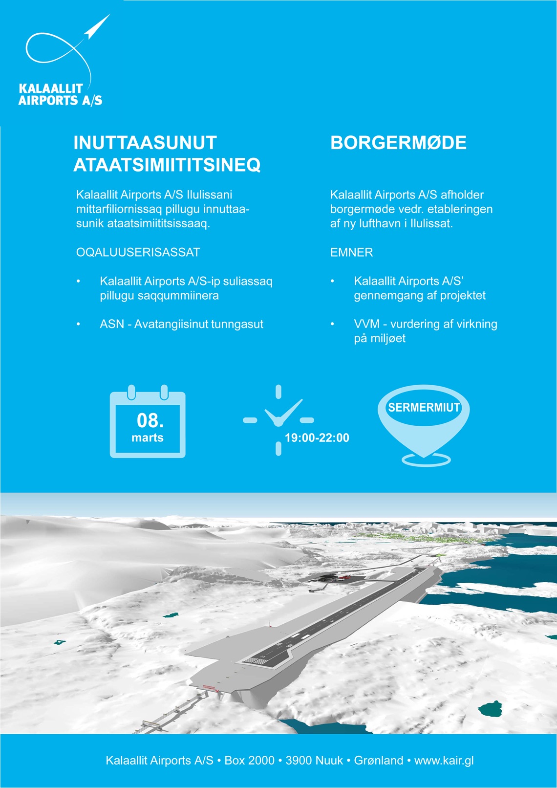 Kalaallit Airports A/S afholder borgermøde vedr. etableringen af ny lufthavn i Ilulissat.