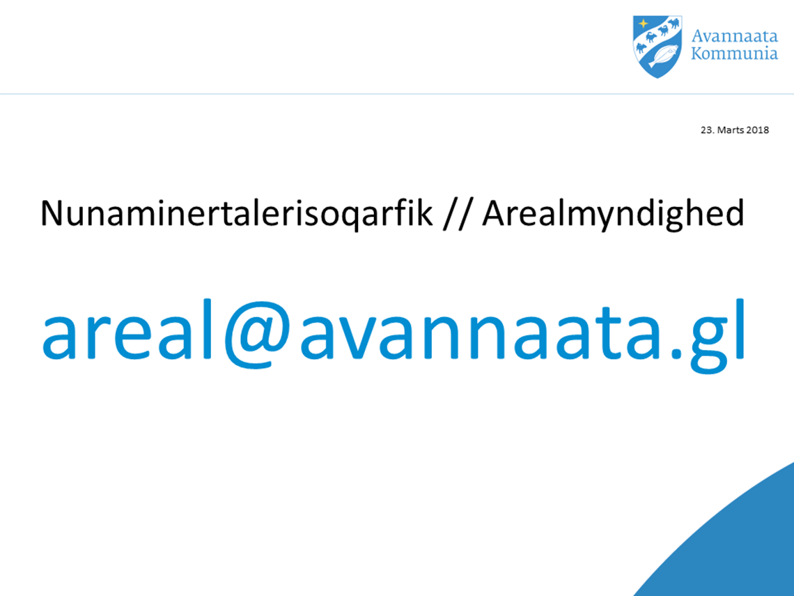 Nunaminertanut tunngassut saaffiginnissutit tamarmik Avannaata Kommunianut ingerlanneqartut, qinnuigissavatsigit emailimut uunga nassiunneqartassasut areal@avannaata.gl