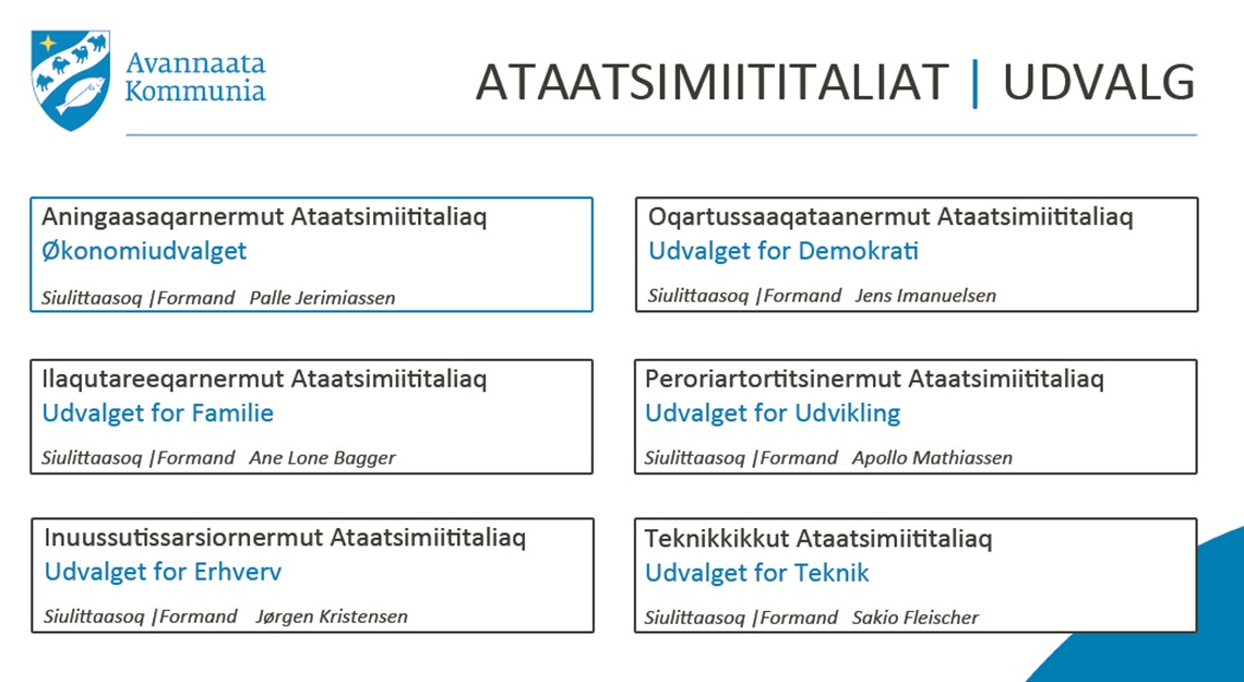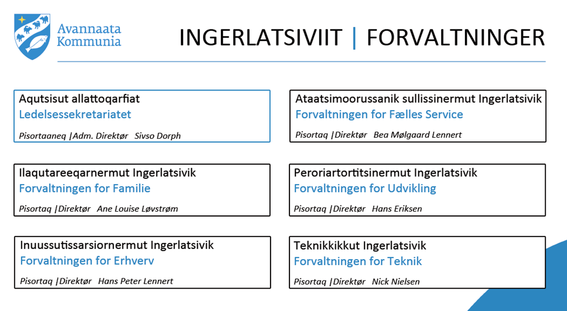 Kommunalbestyrelsen i Avannaata Kommunia besluttede under sit ekstra ordinære møde den 14. marts 2018, at betegnelser på stående Udvalg og Forvaltninger og deraf ansvarsområder på nogle udvalg/forvaltninger ændres.