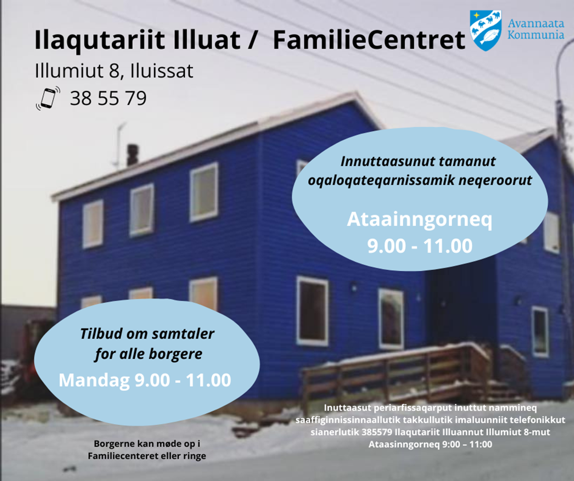 Inuttaasut periarfissaqarput inuttut nammineq saaffiginnissinnaallutik takkullutik imaluunniit telefonikkut sianerlutik 385579 Ilaqutariit Illuannut Illumiut 8-mut Ataasinngorneq 9:00 – 11:00.
