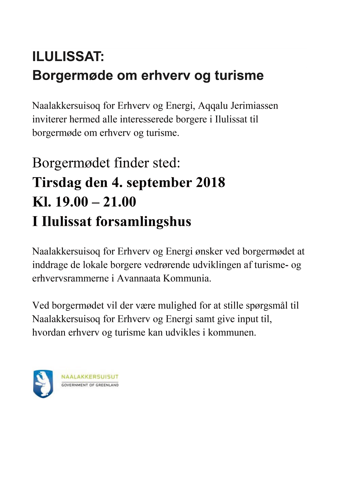 Naalakkersuisoq for Erhverv og Energi, Aqqalu Jerimiassen inviterer hermed alle interesserede borgere i Ilulissat til borgermøde om erhverv og turisme.