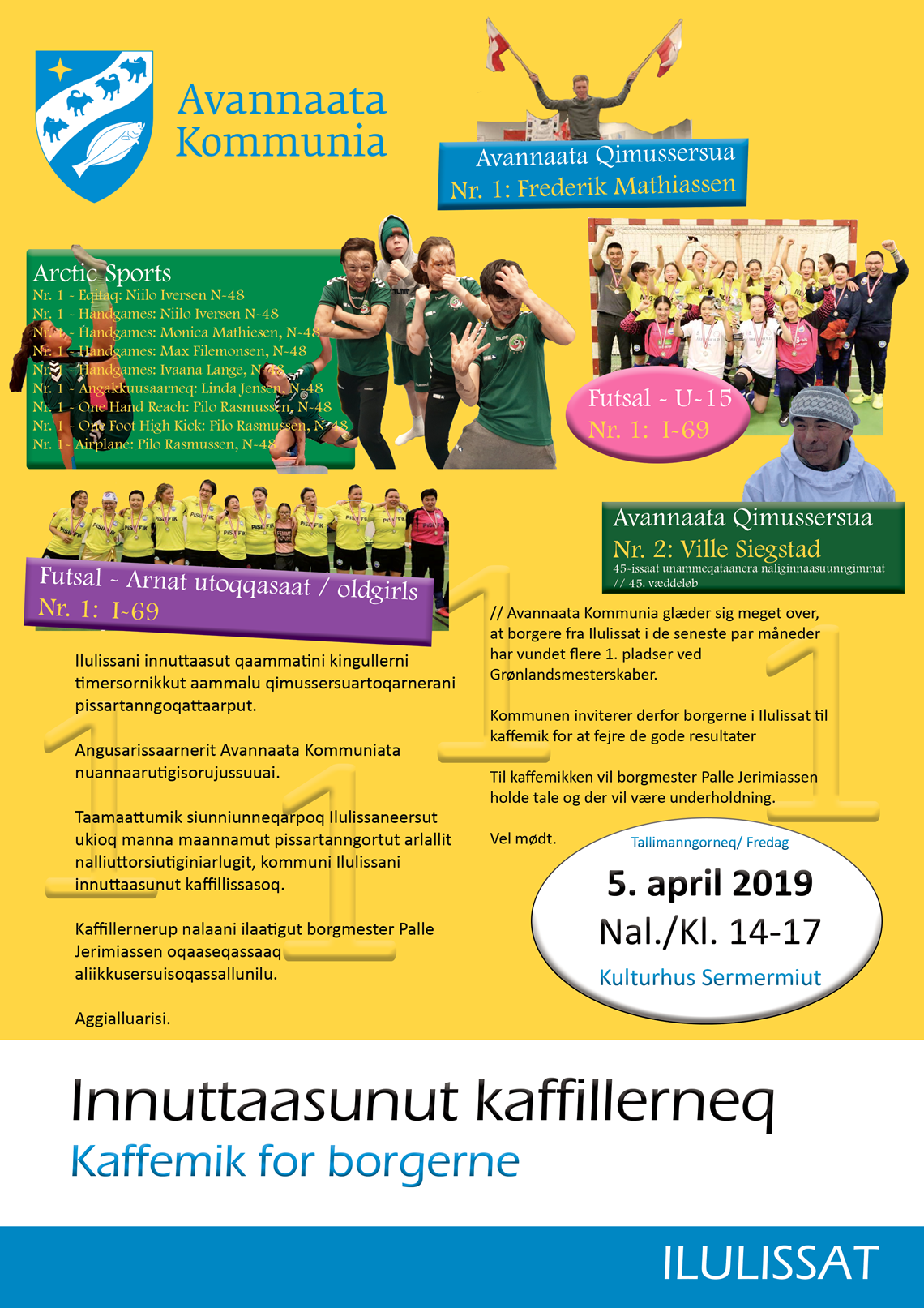 Siden Avannaata Kommunias etableringsfase har det været planen at fejre Grønlandsmestre fra de officielle Grønlandsmesterskaber, som er fra vores kommune. Det kan vi endelig gøre i Ilulissat på fredag den 5/4-19 kl. 14-17 i Kulturhuset Sermermiut, hvor kommunen inviterer til kaffemik. Dette arrangement kan også arrangeres i alle byer/bygder.