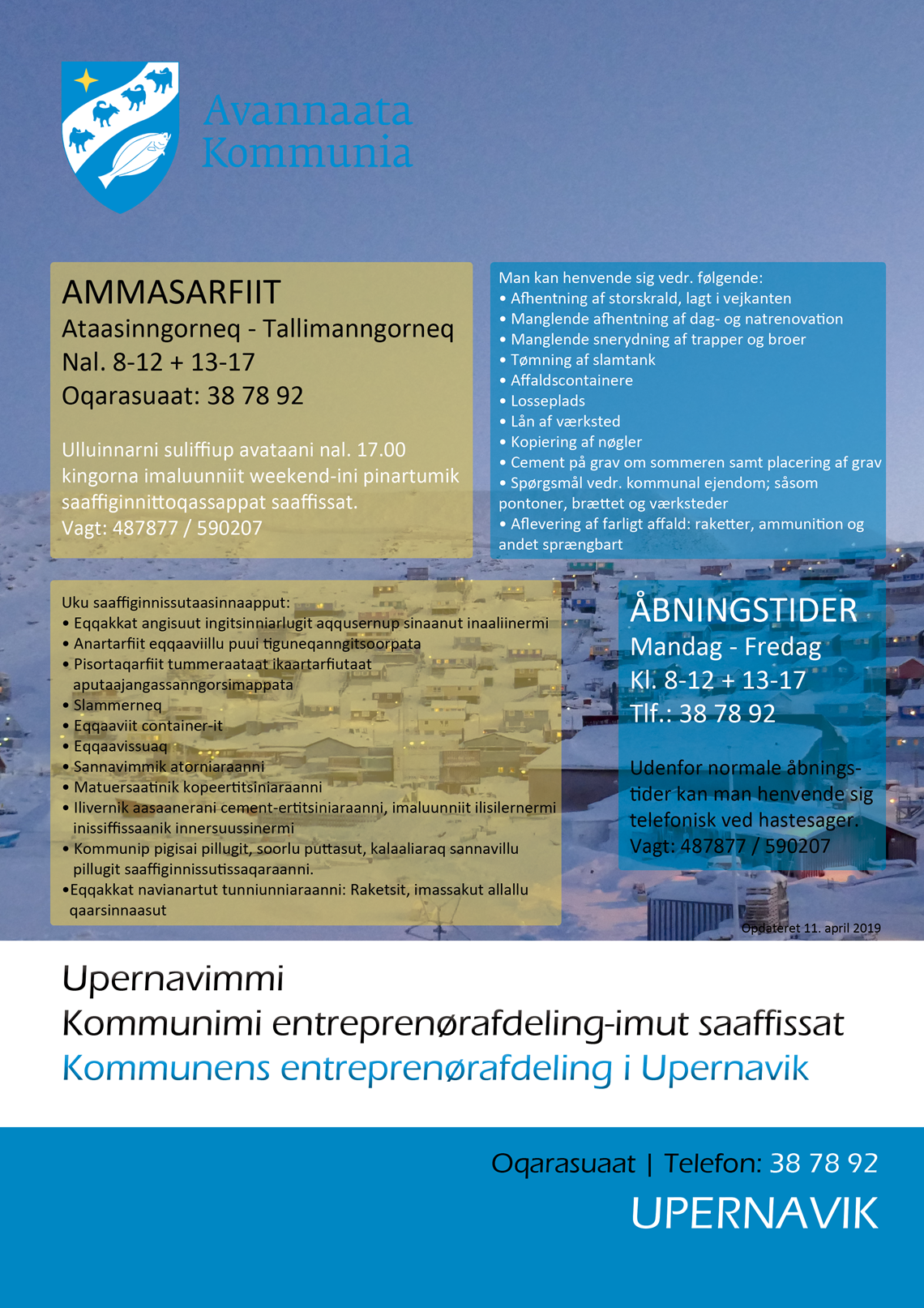 Kommunip entreprenørafdeling ammasarpoq ataasinngornermiik tallimanngornermut saaffigineqarsinnaalluni nal. 8.00 – 17.00, silami sulisut tamarmik nal. 12.00-13.00 ulloq-qeqqartarput.