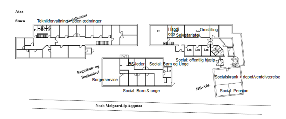 Sulisoqarnermut, nutserisoqarnermut, MISI kiisalu aningaasarsiaqarnermut naatsorsuutilerinermullu immikkoortortaq Sullissivik-usimasumi Kaaleeraq Poulsenip Aqqutaa 3-mi, B-1970-imi inissinneqassapput. Inuussutissarsiornermut immikkoortortaqarfik Kussangajaannguaq 20, B-462-imi inissisimalissaaq.