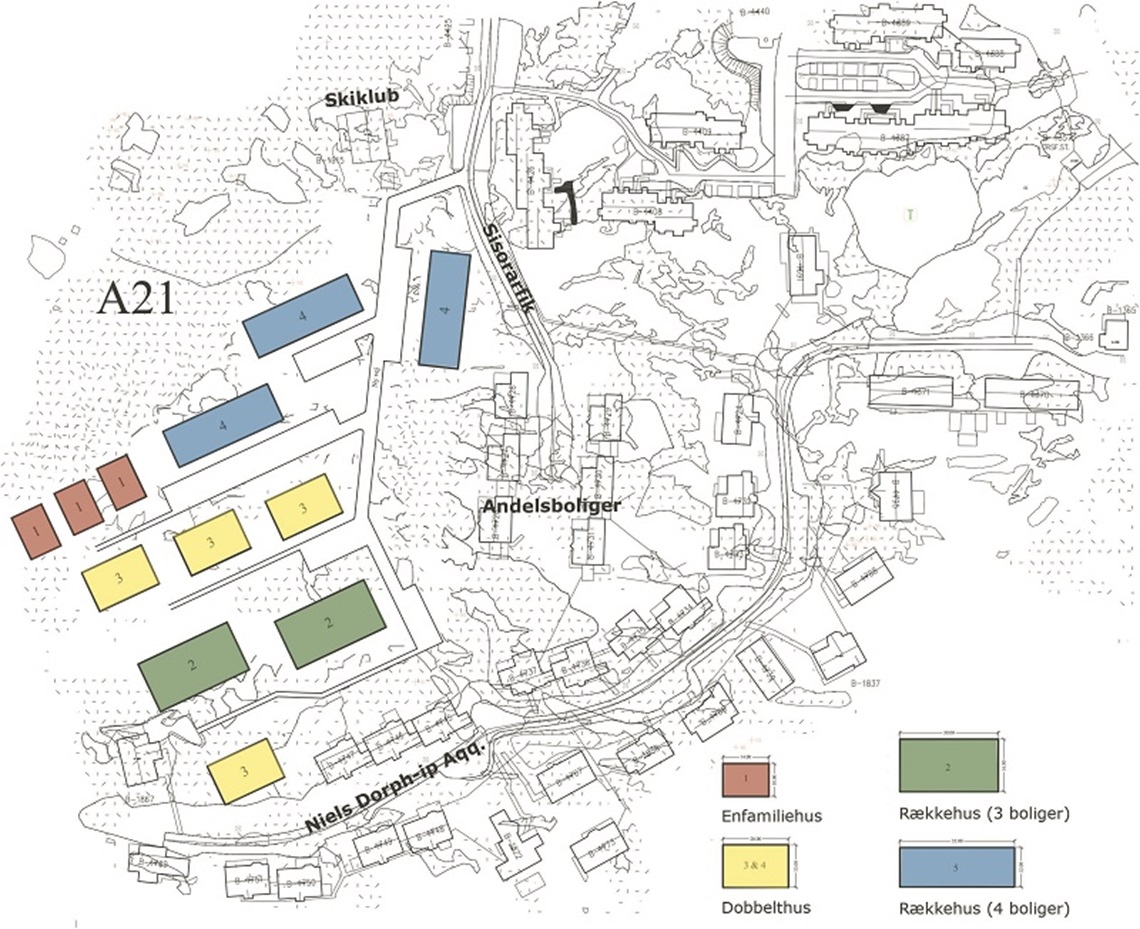 KJ Greenland A/S qinnuteqarpoq sanaartorfissanik illunut assigiingiiaartunut, ilaqutariit illui, illut arfarleriiaat aamma illut uiguleriittut quleriit ataatsitut marluttulluunniit, katillugit inissiat 29-it. Ullumikkut sumiiffimmi A21-mi pilersaarutitut 18-ninik sanaartorfissaqarpoq illut qanittut pukkitsullu. Suliniummili qinnutigisami pilersaaru-titut toqqammaviusoq allanngorteqqaartariaqarpoq, tassa sanaartorfissat sumiuiffiup sanaartugassartaasa inissinneri sumiiffiup pilersaarutaanut naapertuutinngimmat.