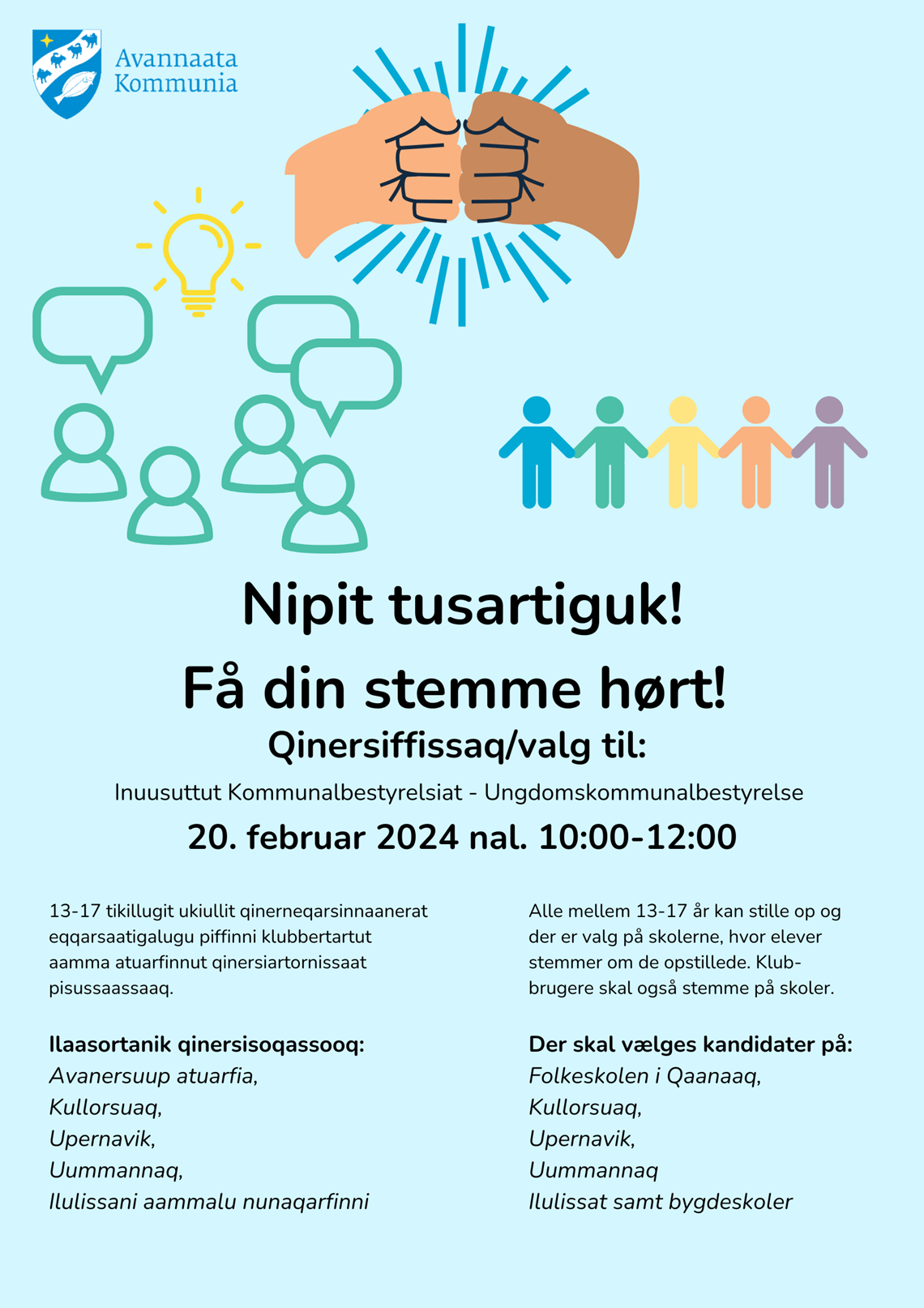 Marlunngornermi 20. februar 2024 Avannaata Kommuniani Meeqqat inuusuttuaqqallu kommunalbestyrelsiannut qinersisoqassaaq.