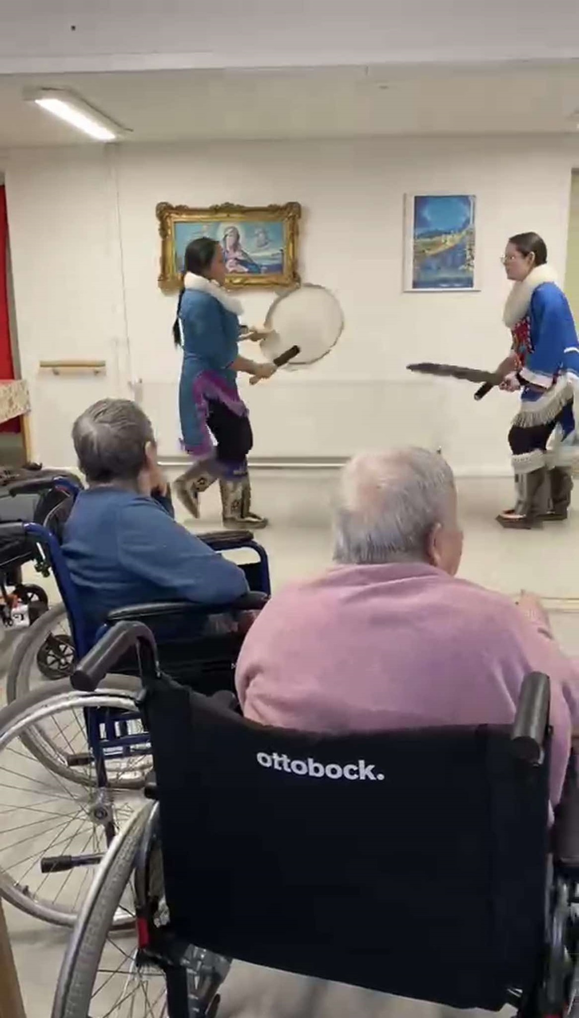 På Plejehjemmet Unganartoq kunne beboerne opleve strubesang og trommedans da Mia Maurice og Taiga Las kom på besøg.