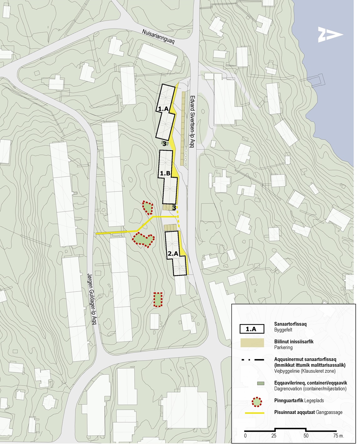 Det reviderede kommuneplantillæg udlægger kun nye muligheder i detailområde 1200-A10.2. Detailområde 1200-A10.1 for ‘De sorte blokke‘ på Jørgen Guldager-ip Aqqutaa forbliver uændret.