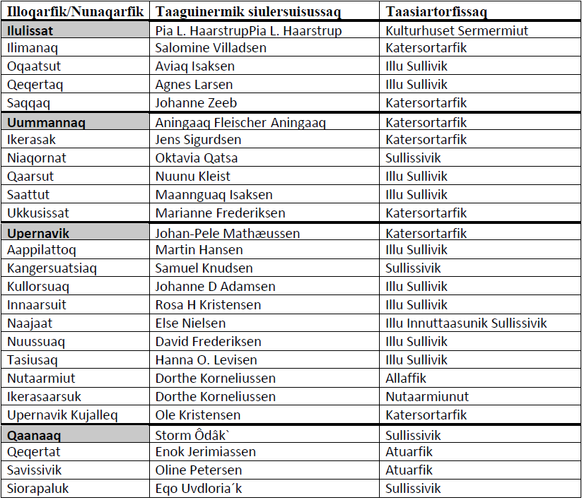 Kalaallit Nunaanni folketingimut qinersinermi 2026-imi Avannaata Kommuniani qinersinermi illoqarfinni nunaqarfinnilu taasiartorfissat aamma taaguinermik siulersuisussat: