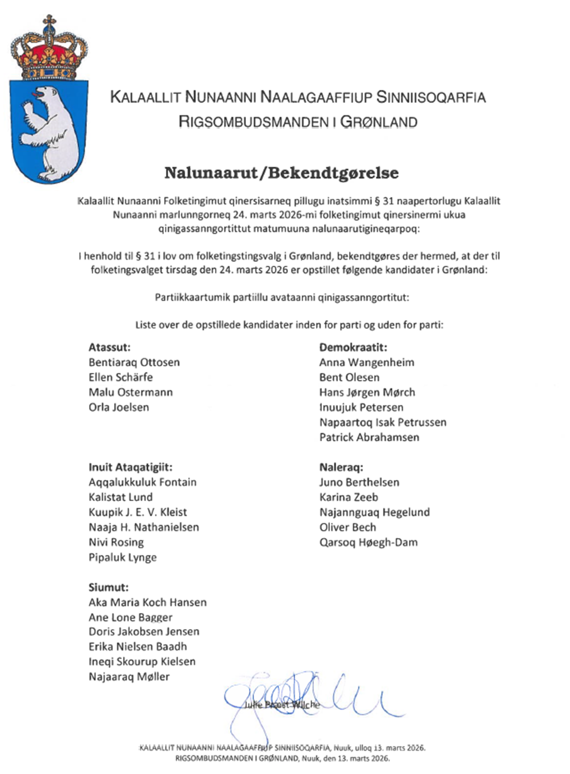 Her kan du se bekendtgørelsen af kandidater til Folketingsvalget i Grønland